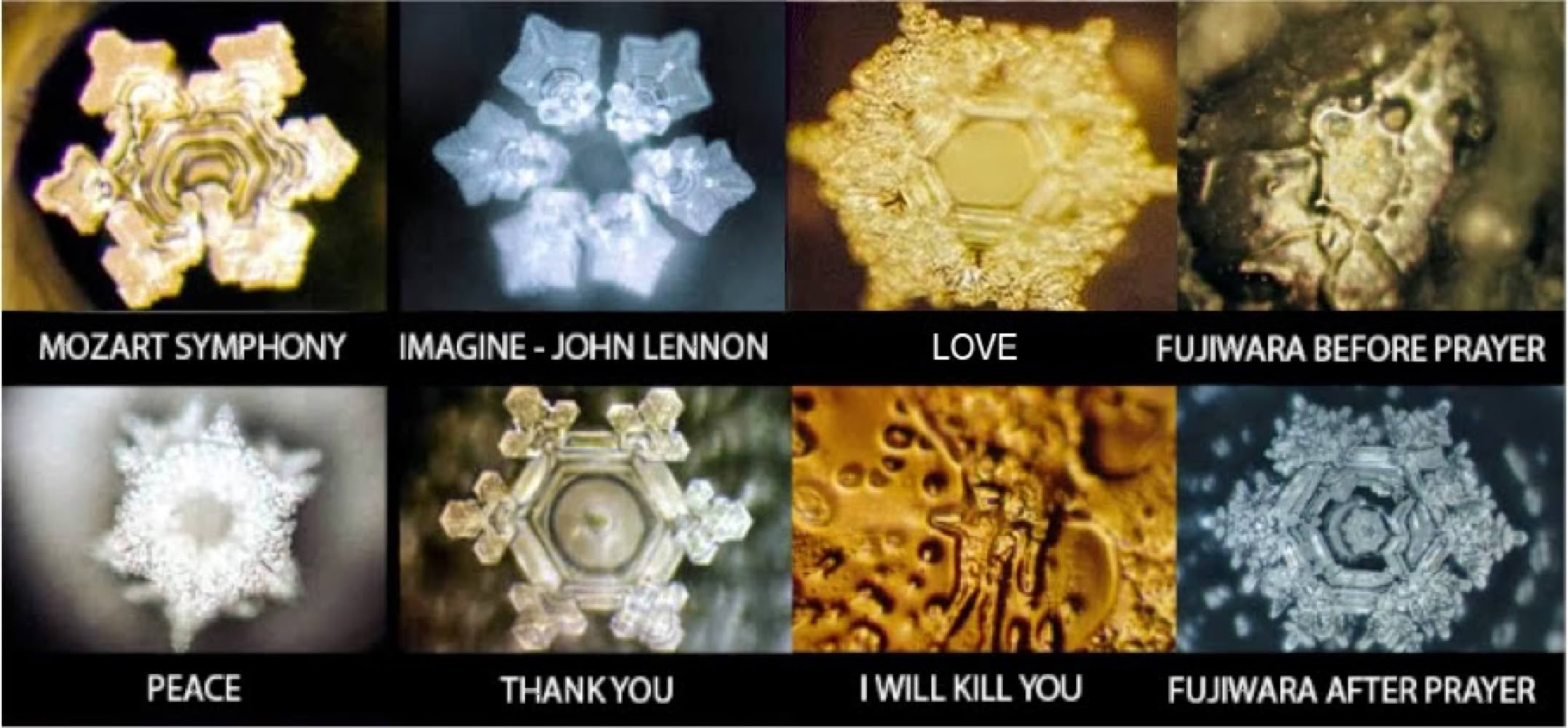 Cela a été démontré par les travaux du scientifique japonais Masuro Emoto qui grâce à l'utilisation de la photographie à grande vitesse, a découvert que les molécules d'eau sont affectées par nos pensées, nos mots et nos sentiments.