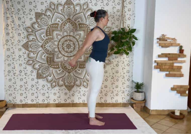 Saisie des mains, bras tendus derrière le dos : étire le devant des épaules, engage les omoplates l’une vers l’autre et vers le bas et ouvre la poitrine. Pour aller plus loin dans l’étirement des épaules aller dans uttanasana avec cette version de bras.