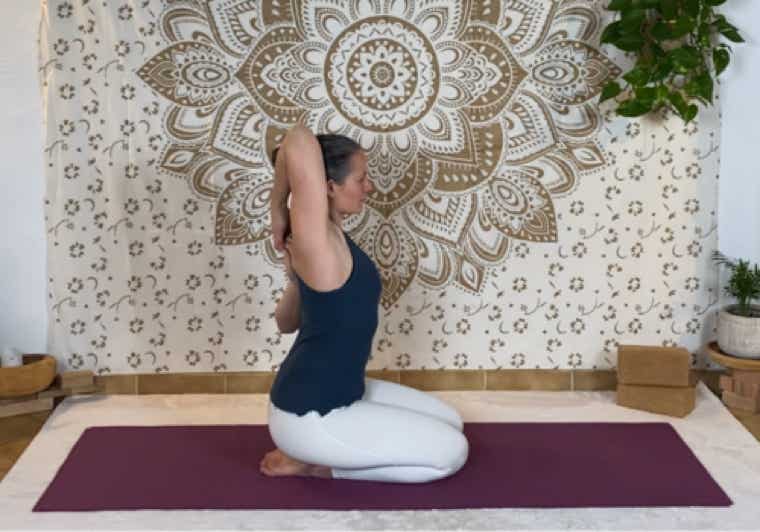 Bras de Gomukhasana : posture clé pour comprendre le positionnement de l’épaule, du coude et de l’omoplate dans la posture de l’arc vers le haut. Elle apprend la rotation externe du bras alors qu’il est levé.